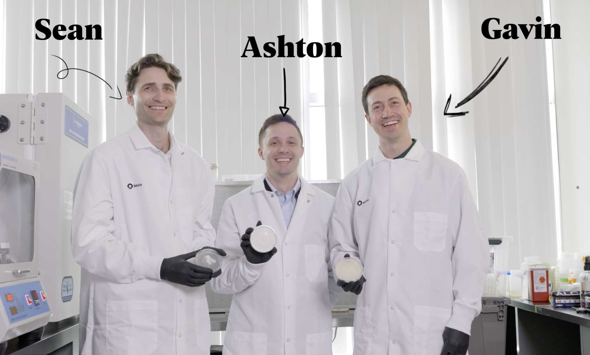 Top view of Maia Farms’ mycelium flour inside a clear glass beaker, showcasing its fine, nutrient-rich texture on a stainless steel lab surface.